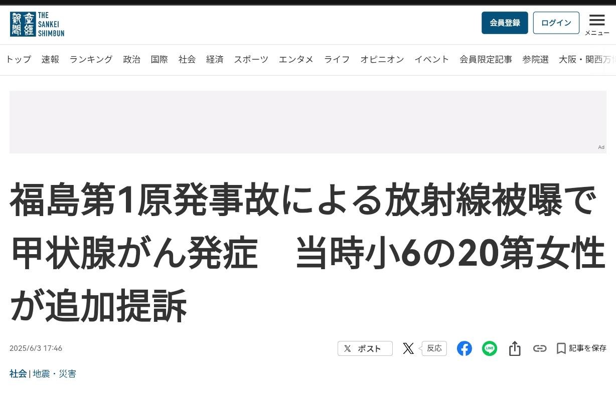 *圖說:產經新聞2025年6月報導,一名20多歲的女性(福島核災時為小六生)加入「311兒童甲狀腺癌訴訟」。(來源:產經新聞