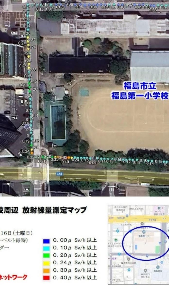 *圖說:小學旁邊的輻射熱點。福島市第一小學周圍輻射檢測。2024年11月時檢測。圖片下方有顏色跟劑量的對照,黃色以上超過國家標準。