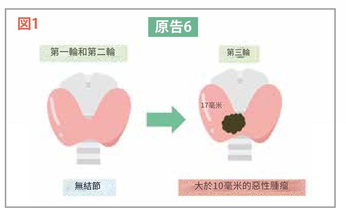 *圖說:第6位原告的狀況(非本文原告),第一次第二次檢查都是沒有結節,第三次檢查發現大於10公厘,達17公厘的惡性腫瘤。