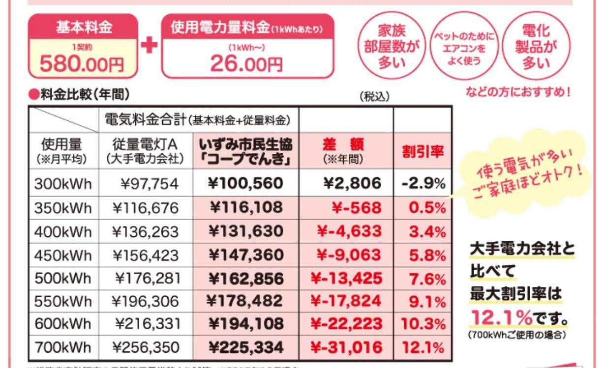 有新的電力公司加入市場,意味著有價格競爭者。例如大阪IZUMI市民生協(消費合作社)」在市場剛開放時標榜,和傳統大型電力公司相比,家戶在大部份的電力消費量區段,都有價格優勢,最高可省下12%的電費(上圖)。
