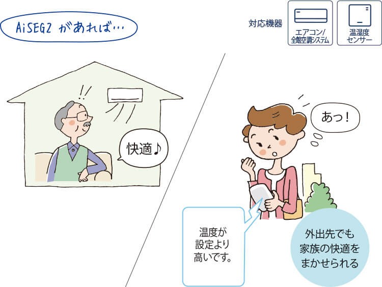 由於老人對於溫度的感知比較遲鈍,遭遇酷暑或嚴寒,可能在不知不覺中忍受到超過身體負荷。若有HEMS實時監控,家人可以設定空調自動開啟,或者因應氣溫變化,在外也能給家中老人開空調(上圖),避免中暑或失溫等狀況。