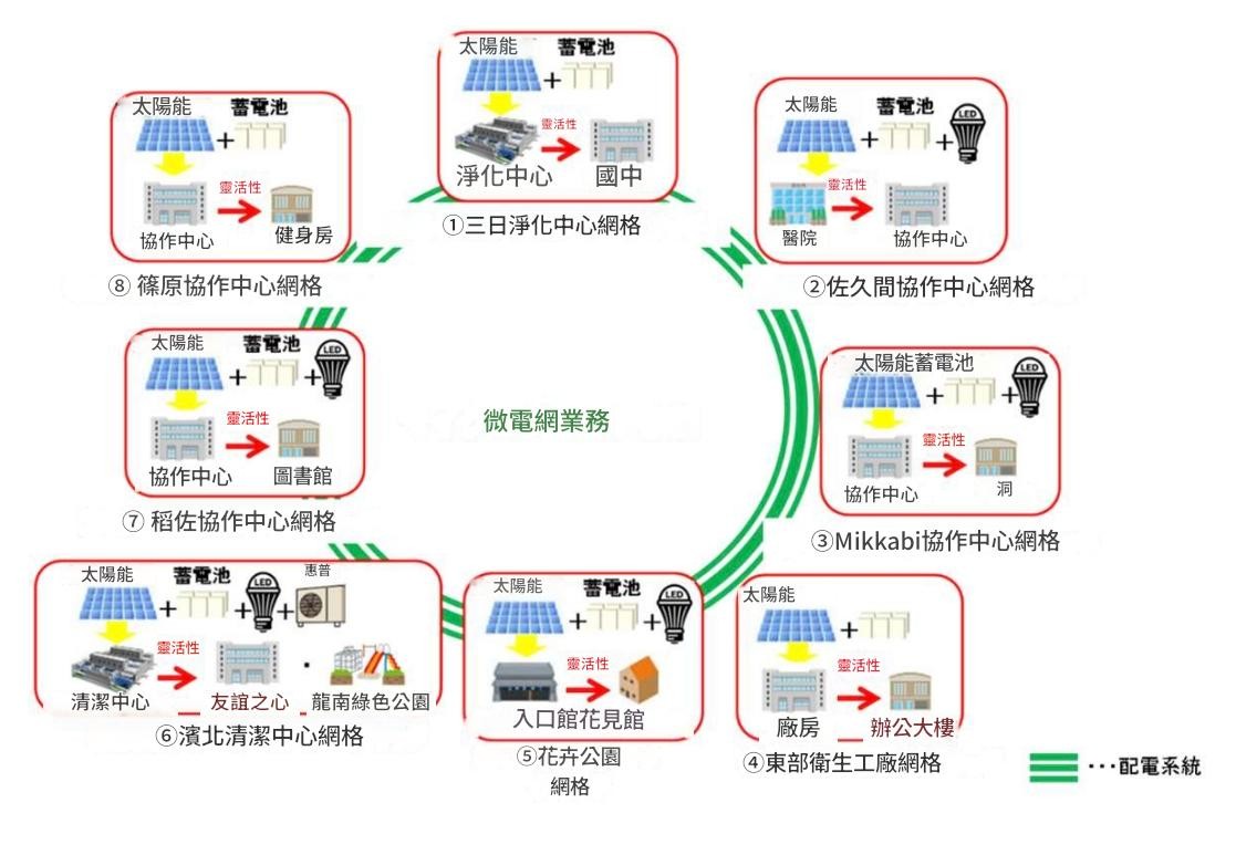 從介紹濱松市微電網的示意圖(下圖),可以具體地看到市內設施是如何構成一個微電網,並且互相串連,互通電力的有無。例如,下圖最上方的微電網,發電設施有三日污水處理廠的太陽能板,透過濱松市設置的送電線給三日國中。