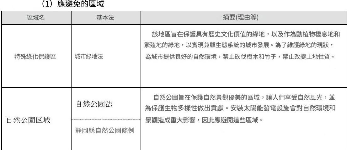 *圖說:在濱松市太陽能設施指導綱要,應避免建設的兩種區域,單單這部份就有17種。(來源:濱松市太陽能指導綱要)