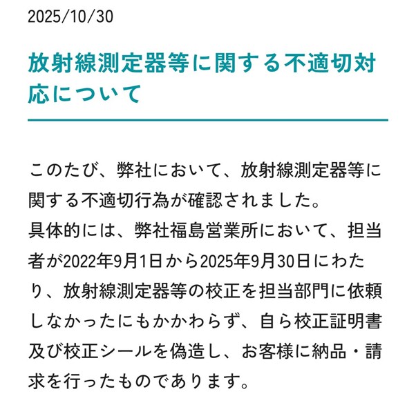 *圖說:「千代田TECHNOL」關於該公司輻射檢測機器未經校準的新聞稿。(來源:官網