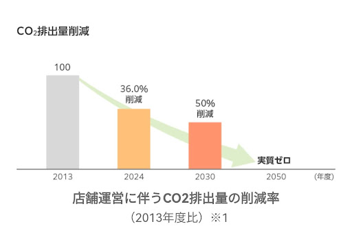 跟日本政府與許多日本企業一樣,日本7-11(Seven & i Holdings Co., Ltd)制定了2050實質零碳政策;並設定中程目標:相比於2013年,2024年度做到減碳36%,2030年度要做到碳排減半(下圖);相比於2014年度再生能源用電佔比10%,2030年要提高到40%。