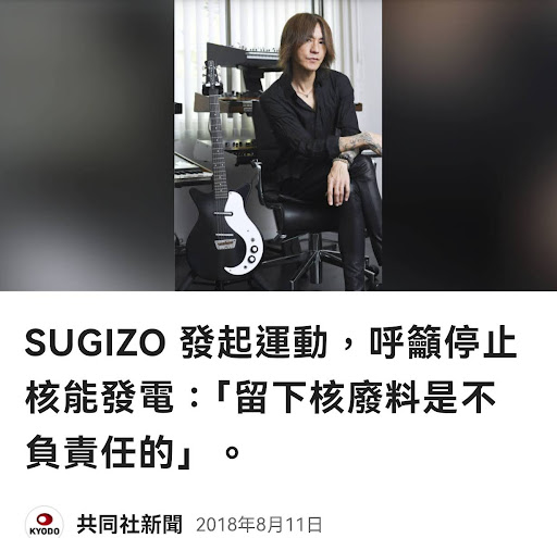 長年來,SUGIZO參與多個反核盛事,像是2012年的「反核世界會議」、2021年,和「人人電力」合作的福島義演等(參照媽盟文章:一青窈愛用的電力公司是?)。就像這次,平常也會在專訪或自己的社群媒體帳號發聲。